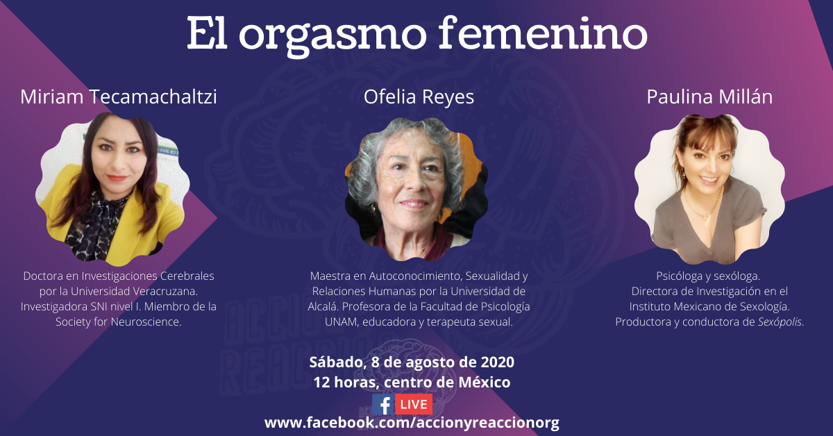 Para responder todas esas preguntas y más, el próximo sábado, en conmemoración por el Día Internacional del Orgasmo Femenino, tres expertas de diferentes disciplinas platicarán con las y los seguidores de Acción y Reacción sobre este tema por Facebook Live.