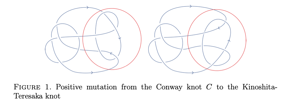 De hecho el Nudo de Conway también evade al invariante s de Rasmussen, pero Lisa probó este invariante en un nudo diferente, uno más sencillo pero que en su esencia es gemelo al de Conway. Al nuevo nudo se le conoce como mutante y se logra girando un pedazo del de Conway (el de la línea roja de abajo).