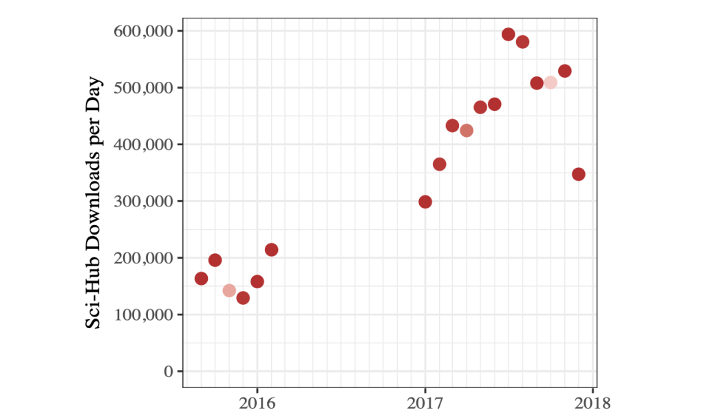 Un grupo de investigación estadounidense liderado por Daniel S. Himmelstein (1) dio a conocer que para marzo de 2017, Sci-Hub contenía “68.9 por ciento de los 81 millones de artículos académicos de Crossref” (agencia que registra recursos digitales) y “85.1 por ciento de los artículos publicados en revistas de pago”.