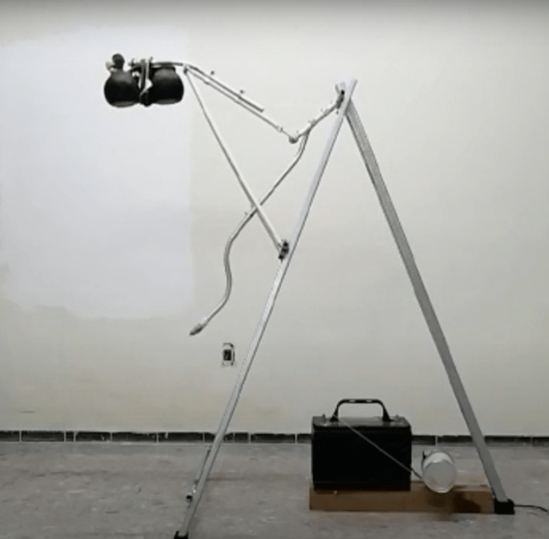 La luz activa el balanceo de la máquina, no hay rechinido en su movimiento, el crujir metálico esperado se reemplazó por el soplido de un cuenco, dentro de este hay agua, tras el inicio del balanceo el líquido se mueve y la presión del aire detona en sonido. Lo que escuchamos no es aleatorio, las vibraciones y el diseño zoomorfo del cuenco están inspirados en el canto de las aves.
