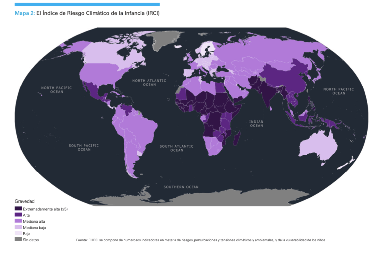 El reciente informe de la Unicef dio a conocer por primera vez el Índice de Riesgo Climático de la Infancia (IRCI) el cual considera dos indicadores: por una parte la exposición a escasez de agua, inundaciones, ciclones y olas de calor, por otra, la vulnerabilidad de la infancia en términos de salud, nutrición, educación, pobreza y protección social.