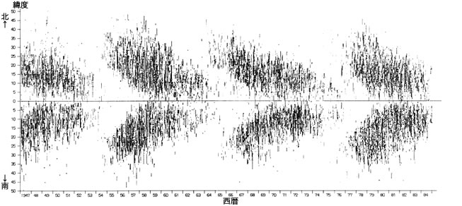 También se sabe que estas manchas tienen un comportamiento particular que es evidente cuando se grafican las altitudes en las que aparecen estas manchas a lo largo del tiempo. Resulta que al inicio del ciclo solar, en su mínimo de actividad, las machas solares se forman cerca de los polos del Sol. Al avanzar el ciclo y aumentar la actividad del sol, las manchas se van hacia el ecuador de la estrella. Si se observa en una gráfica este comportamiento es visible un diagrama de mariposa que se repite cada 11 años.